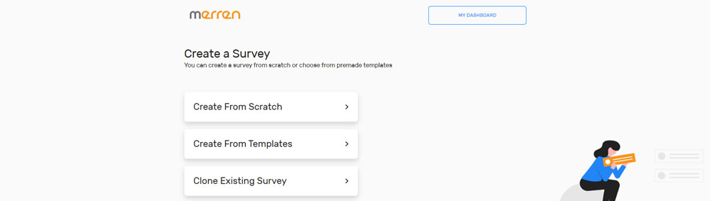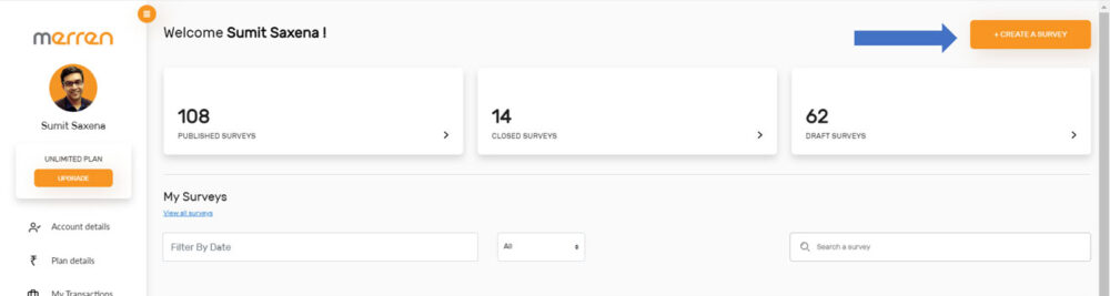 - Once you login, you would see your dashboard. To create a new survey, click on “Create Survey” on the top-right corner of your screen