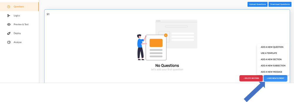 - You can now click on “Add New Element” to add a new question or a message. The difference between a question and a message is that Merren waits for a response from the survey taker in the case of a question, unlike in the case of a message where no response is expected.