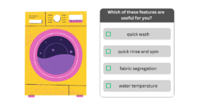 Checklist style format means that a certain question will have different options. It will ask customers to choose options that will fit the criteria. For example a product (say a washing machine) will have certain features. They would require customers to choose the features relevant for them. ‘Which of these features are useful to you?’ and answers could be along the lines of ‘quick wash’, ‘segregates fabrics’, ‘water temperature adjustments’ to name a few.