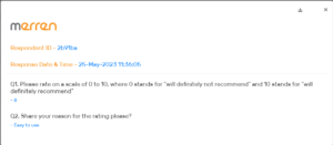 Merren has a robust dashboard that segregates every response as per its specific feature. It can also segregate open ended responses as per the types of words people have frequently used. This can give you a clear picture of how to attend to unhappy customers and find upselling opportunities for happy customers.